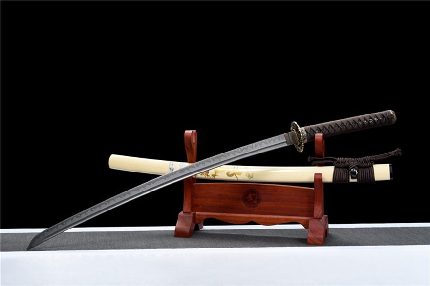 精品T10树叶纹烧刃研磨灰打刀《应龙》20220940〖性能〗手工18道研磨,镜面研磨工艺,硬度60°砍铁不伤刃,刚柔相济!超高性价比高!带鞘全长103厘米,刃长71厘米,柄长26厘米,刃宽3.2厘米。实木大漆鞘彩绘似水龙王配粗下绪,赠高端锦盒