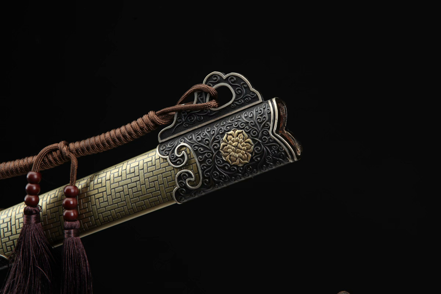全长:110cm 除鞘长:101cm刃长:71cm 柄长:30cm刃厚:0.7cm 刃宽:3.1cm总重:2.2kg 除鞘重:1.22kg三色铜玄宗唐刀(黄铜鞘款)。装具:纯铜精雕、古法鎏金、银、古铜三种颜色;剑鞘:纯铜手工包铜、刻花,将木梢用铜皮包上后起到防潮防湿、禁锢剑装作用、既美观又不会因天气、时间久远而收缩开裂、刀柄包鲨鱼皮高档大气;刀身:百炼花纹钢、精细手磨13932070。花纹钢烧刃另加155。