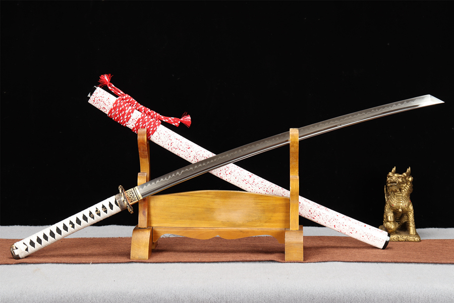 〖性能〗覆土烧刃工艺,铜装刀镡,珍珠鱼皮垫纸,手工16道手工研磨,可试斩矿泉水,秒草席,麻绳,刚柔相济,超高性价比高,实木油漆