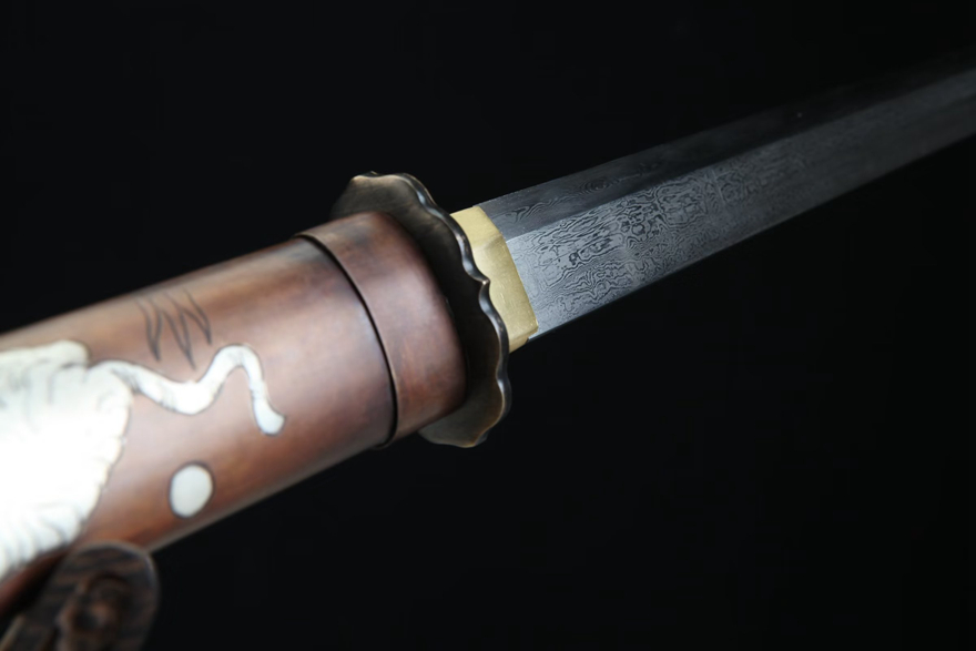 刀鞘刀柄采用纯铜手工包铜、刻花,将刀梢用铜皮包上后起到防潮防湿、禁锢剑装作用、既美观又不会因天气