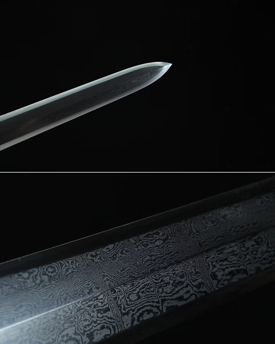 剑身:百炼花纹钢、手工锻造、精细手磨