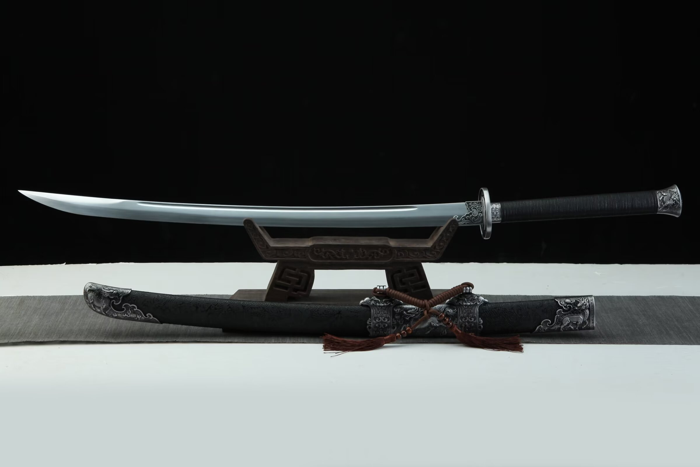26寸合金仿古银“风火麒麟”宝刀(黑色包皮—刀身亮面开槽款)。