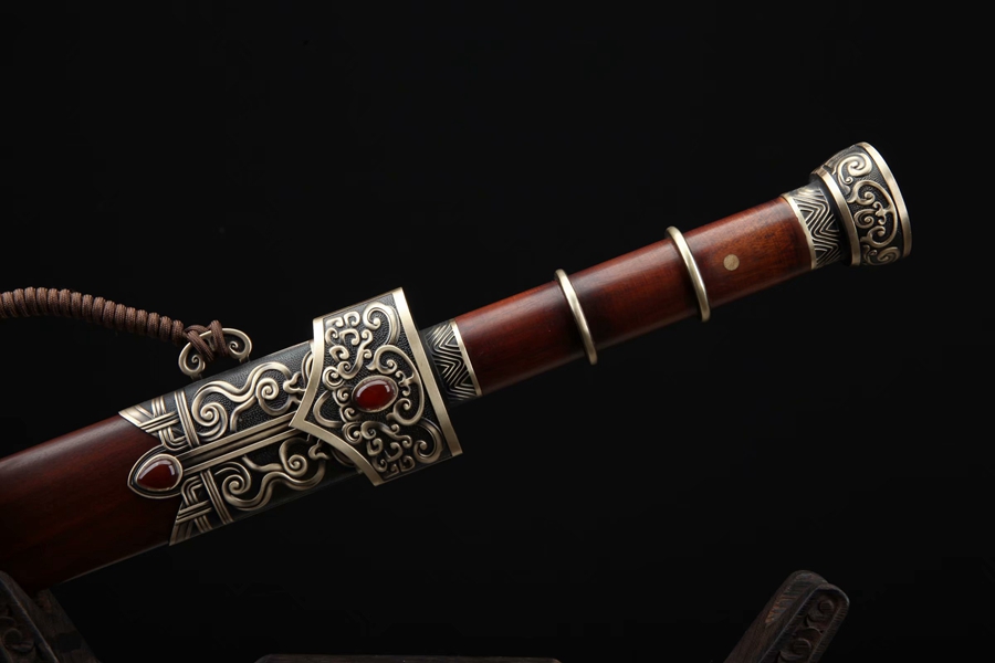 剑鞘:优质酸枝木;剑身:百炼花纹钢、手工锻造08281250。花纹钢烧刃另加115。