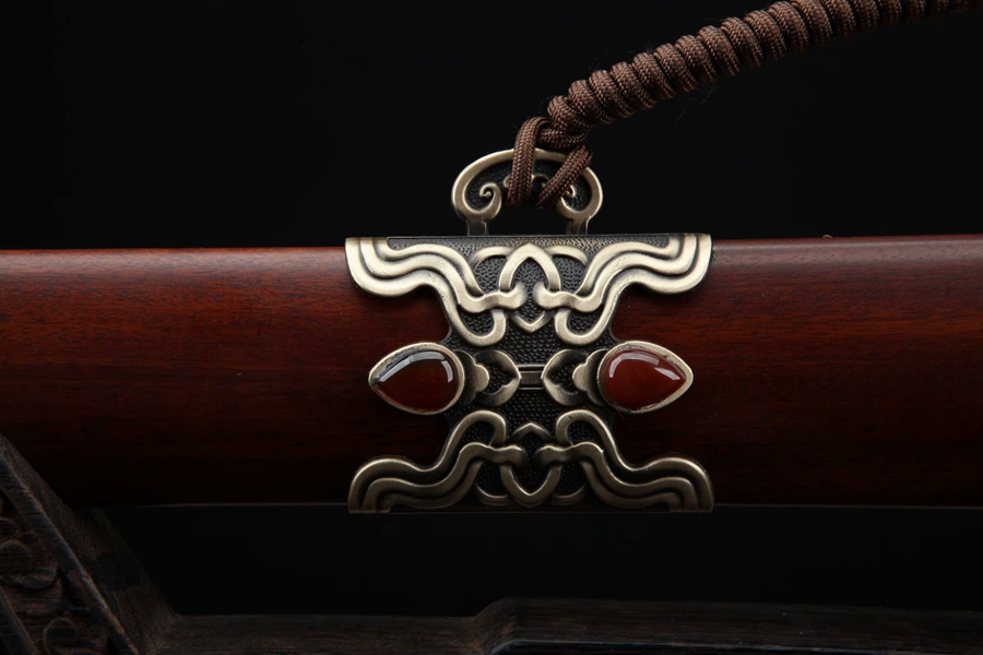 总重:2.4kg 除鞘重:1.52kg。装具:纯铜精雕、精细打磨做旧、镶嵌红色玉宝石;