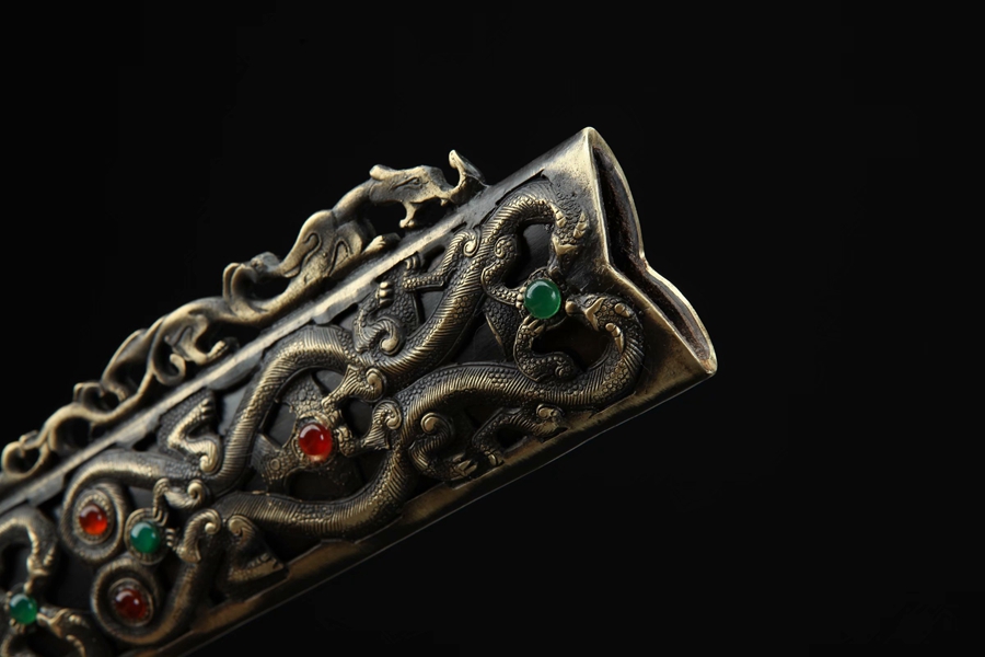 剑鞘、剑把用纯铜镂空精铸、精细打磨并镶嵌玉石;剑身采用百炼花纹、手工锻造、