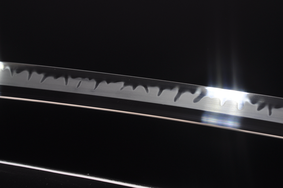 本作品由传统的敷土工艺进行局部淬火制造出HRC60的刃口,HRC50的刀背,