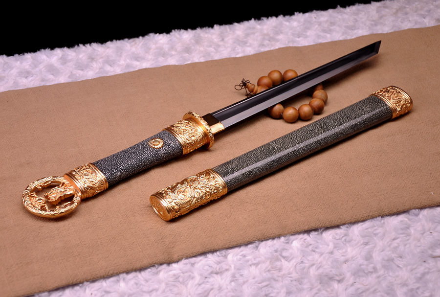刀柄刀鞘为木胎包珍珠鱼皮;装具为黄铜精雕镀24k真金;是赠送亲密爱人的不二之选。