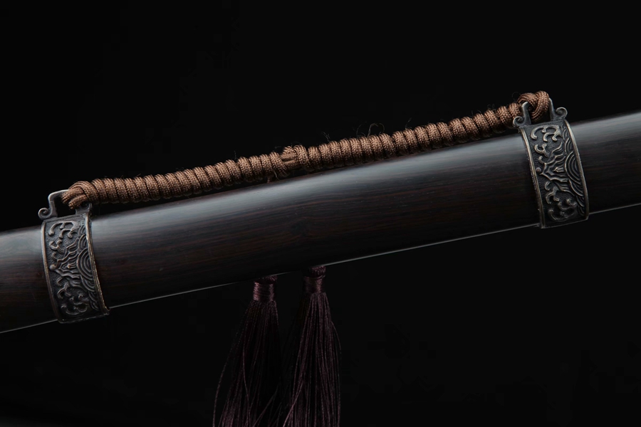剑鞘:优质黑檀木;剑身:百炼花纹钢、手工锻造、精细研磨09372390。花纹钢烧刃另加155。