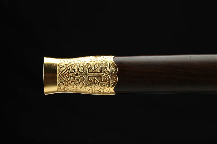 全长:87cm 除鞘长:83cm刃长:60cm 柄长:23cm刃宽:4cm 刃厚:1cm 总重:2.46kg 除鞘重:1.74kg装貝:纯铜精雕、精细打磨、镀24K真金;剑鞘:优质黑檀木;剑身:百炼花纹钢、手工锻造、精细手磨15212000。花纹钢烧刃另加110。
