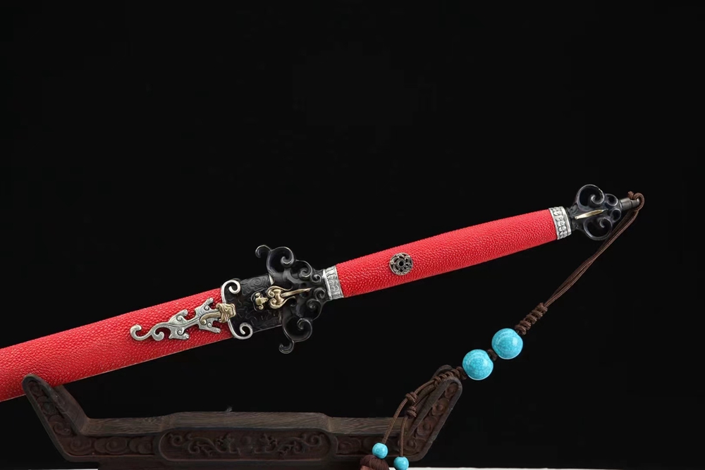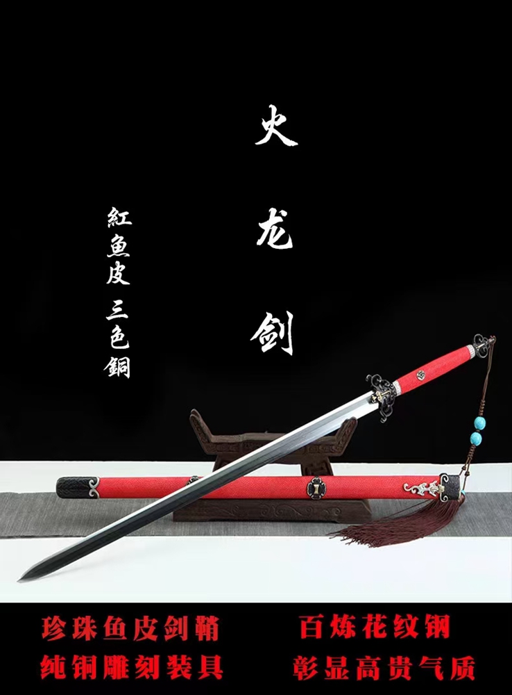 装具:纯铜精雕、古法鎏金、银、铜三色;剑鞘:红色粗颗粒真鱼皮;剑身:百炼花纹钢、手工锻造、精细手磨16993700。花纹钢烧刃另加155。(高端制作、值得珍藏!)