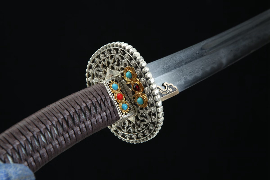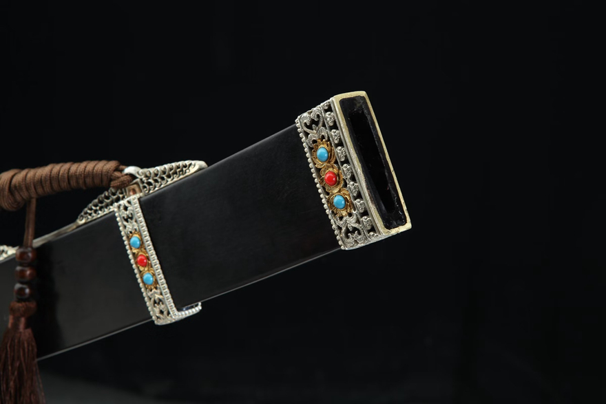 装貝:纯铜镂空精雕、古法鎏金银;镶嵌红绿玉宝石;刀鞘:优质黑檀木;