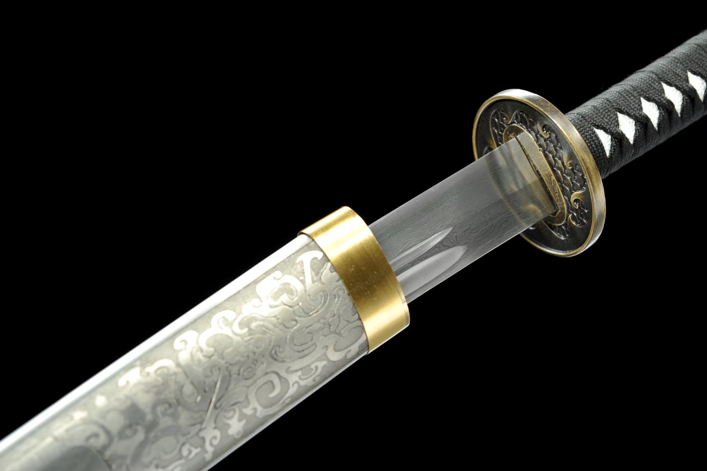 装具:合金装镀青古铜;刀鞘:用金属材料手工制作、仿古银设计处理、刻花、