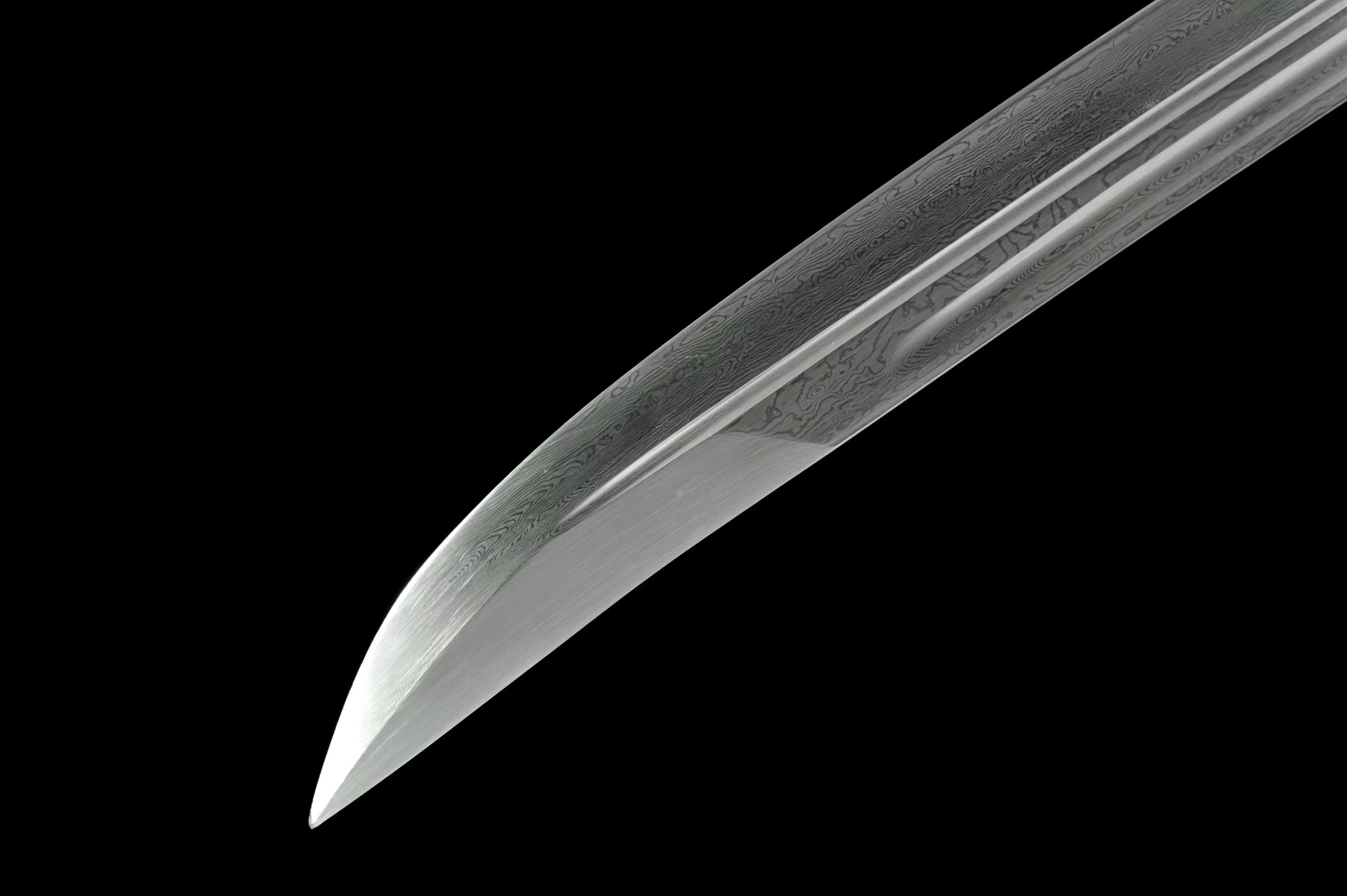 刀柄:手工缠绳、内付真鱼皮;刀身:百炼花纹钢、手工锻造、精细手磨