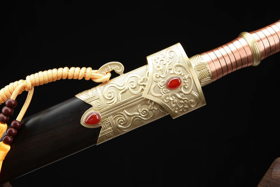 装具:纯铜精雕、精细打磨、亮铜、镶嵌红色玉宝石;剑鞘:优质黑檀木;