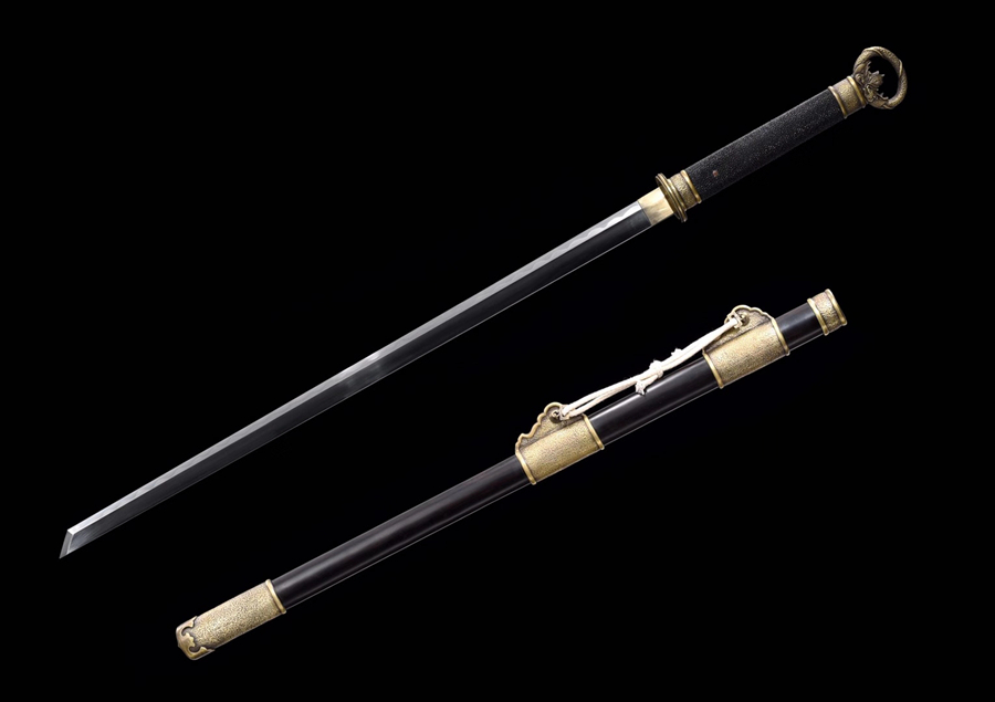 刀身采用百炼花纹钢古法锻造,十三道手工精细研磨,刃口研白;刀鞘为上等紫光檀制作,刀柄包鲛鱼皮;刀装为黄铜复古装。