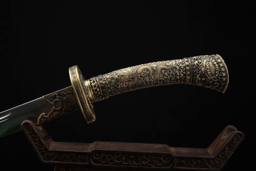 纯铜镂空精雕、黑檀木、百炼花纹钢03703630。花纹钢烧刃另加155。