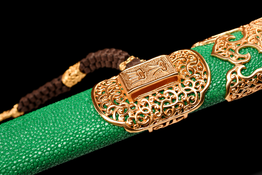 十三道手工精细研磨;剑鞘为重蚁木珍珠鱼皮;剑装为黄铜镂空镀真金,金龙闪耀;整剑华丽且风格独特个性。