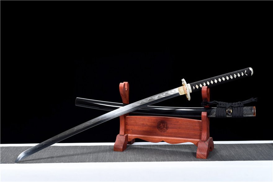 作品总长103cm、刃长71cm、柄长27cm、刃宽3.2cm。刀刃采用T10纯手工古法工艺锻打制作,(覆土烧刃火焰纹,刃纹是自然生成每一个作品都是独一无二,不可复制);刀装为黄铜溜金;刀柄为木芯整包上品珍珠鱼皮,刀鞘为实木油漆亮黑色鞘口半包珍珠鱼皮《鲤口,栗形,挡,均为黑牛角》
